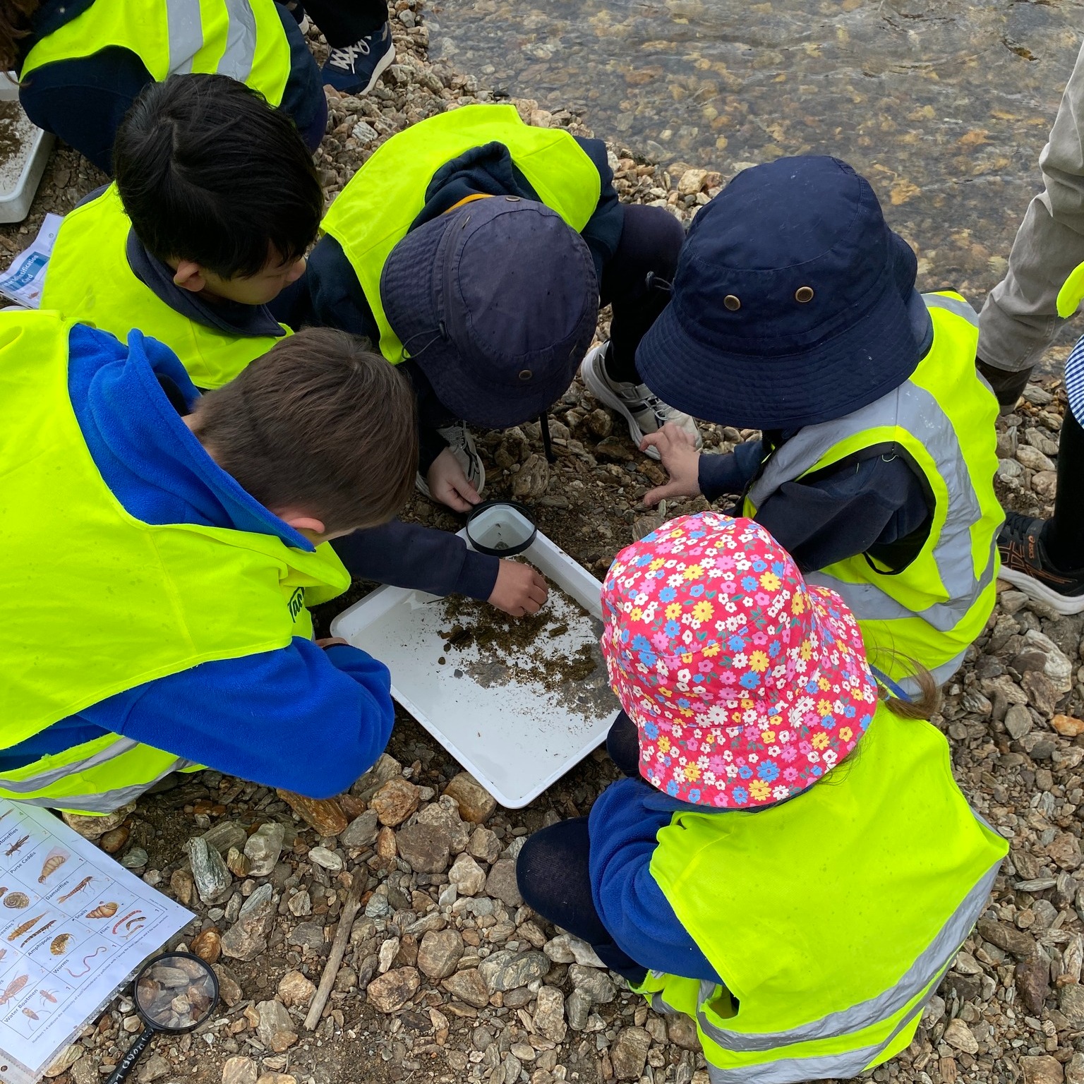 Ākonga from Alexandra Primary School identify different macro-invetebrates at Orkney wetlands