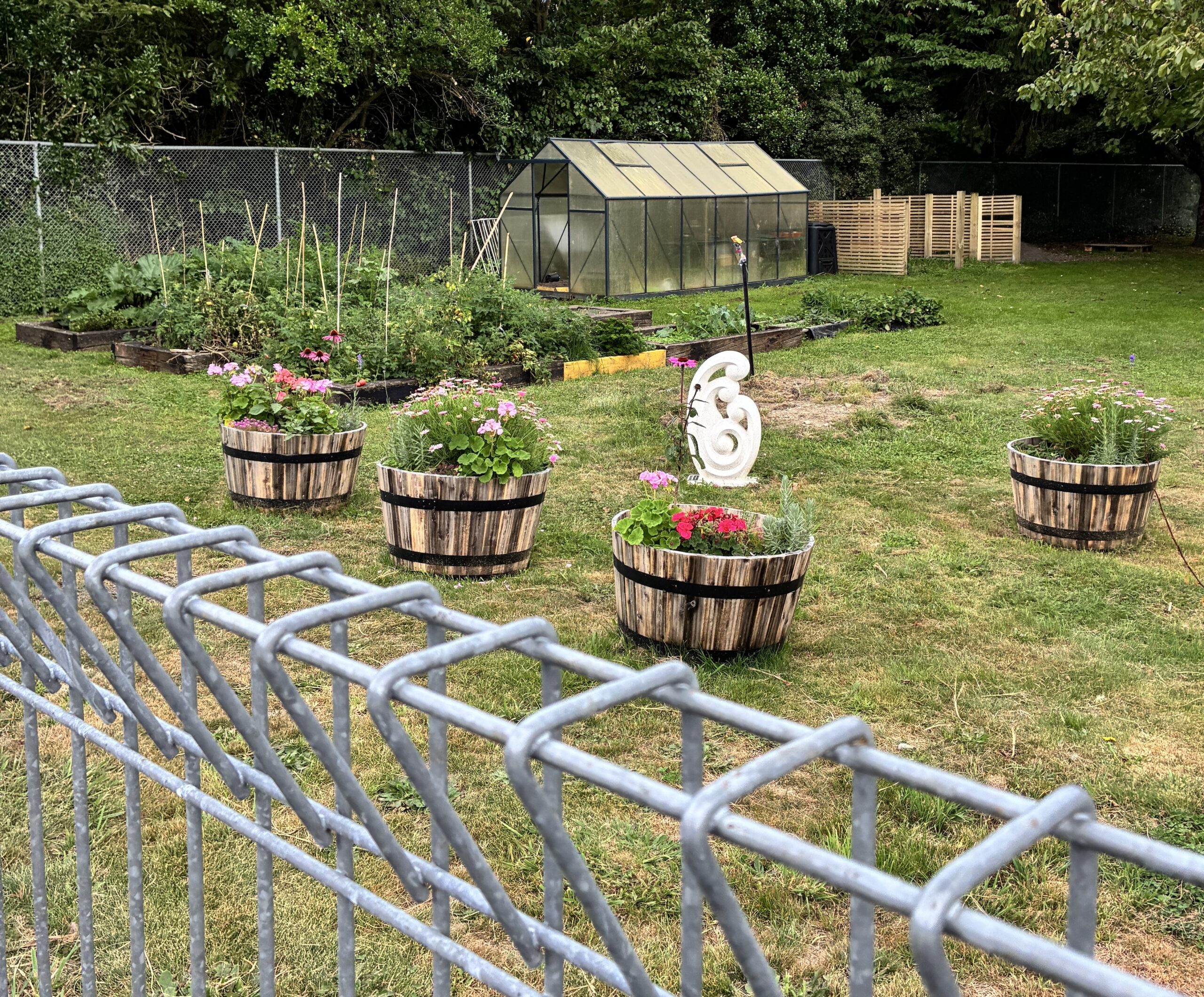 Community view of the garden area with the sensory gardens in the barrels.