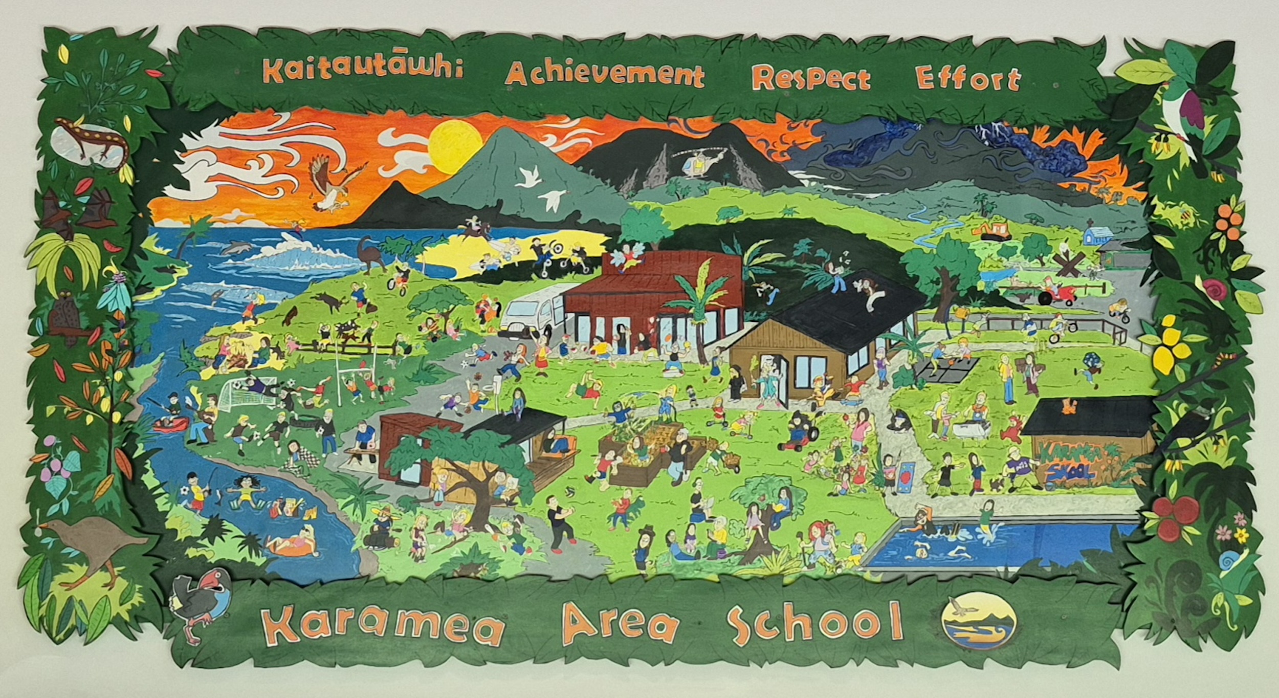 Karamea Area School’s values via PB4L (positive behaviour for learning) are depicted proudly on the top border.