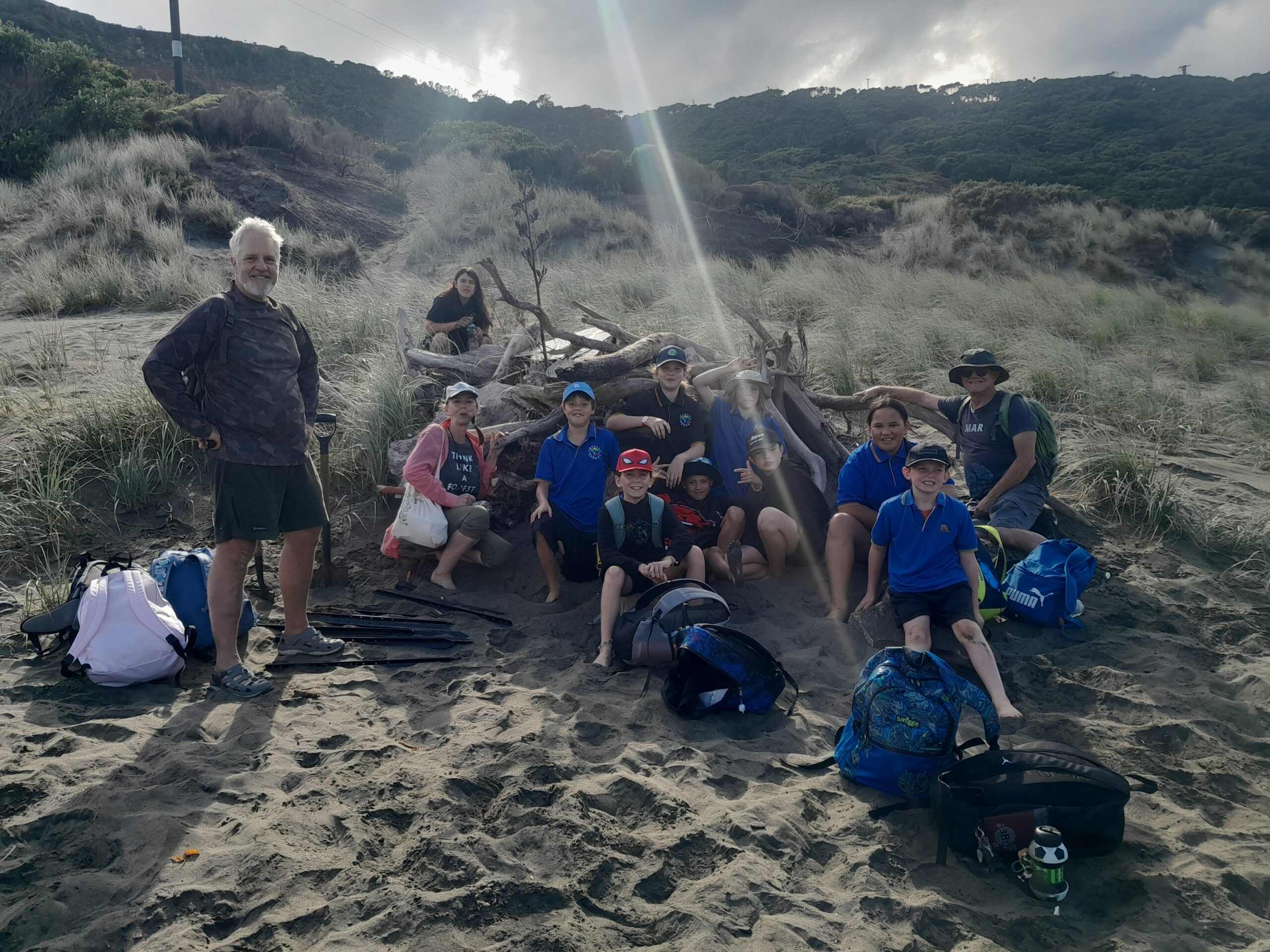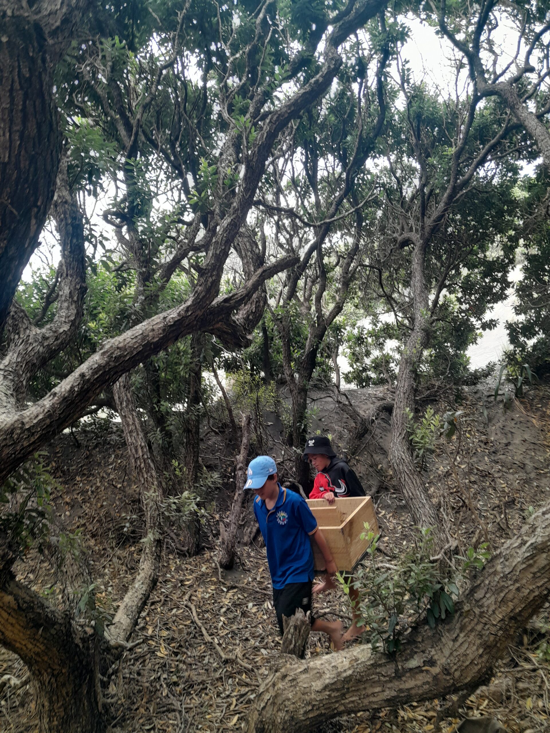 Kororā Te Henga are a conservation group who started in 2024 to monitor the status of penguins along the Te Henga/Bethells beach coast. To safeguard the habitat of kororā, little blue penguins, the year 5-8 Swanson school students built nesting boxes in 2025, and the students were about to put them in place before the nesting season.
