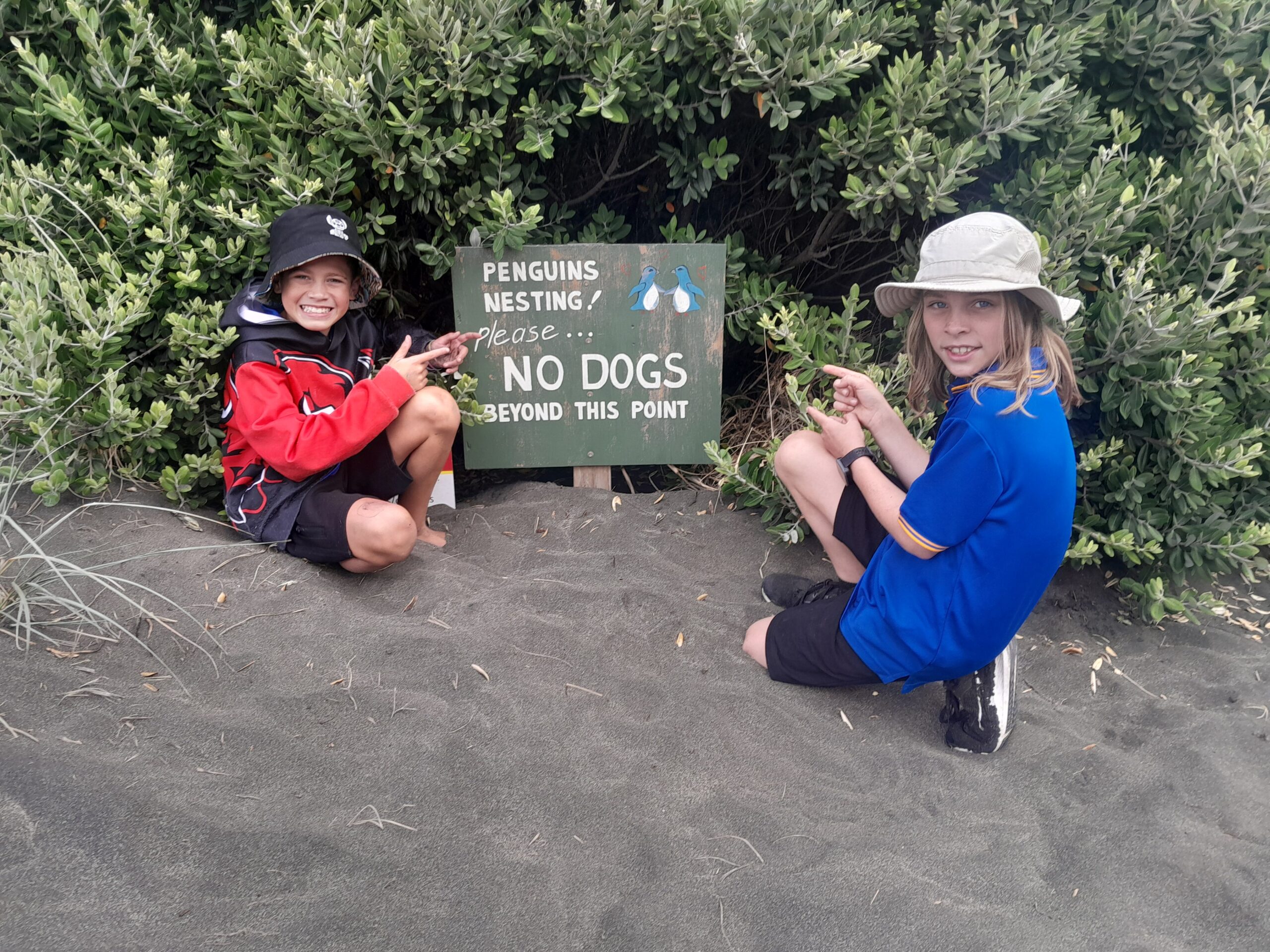 Students pointing out signs to raise awareness of kororā nesting in the area