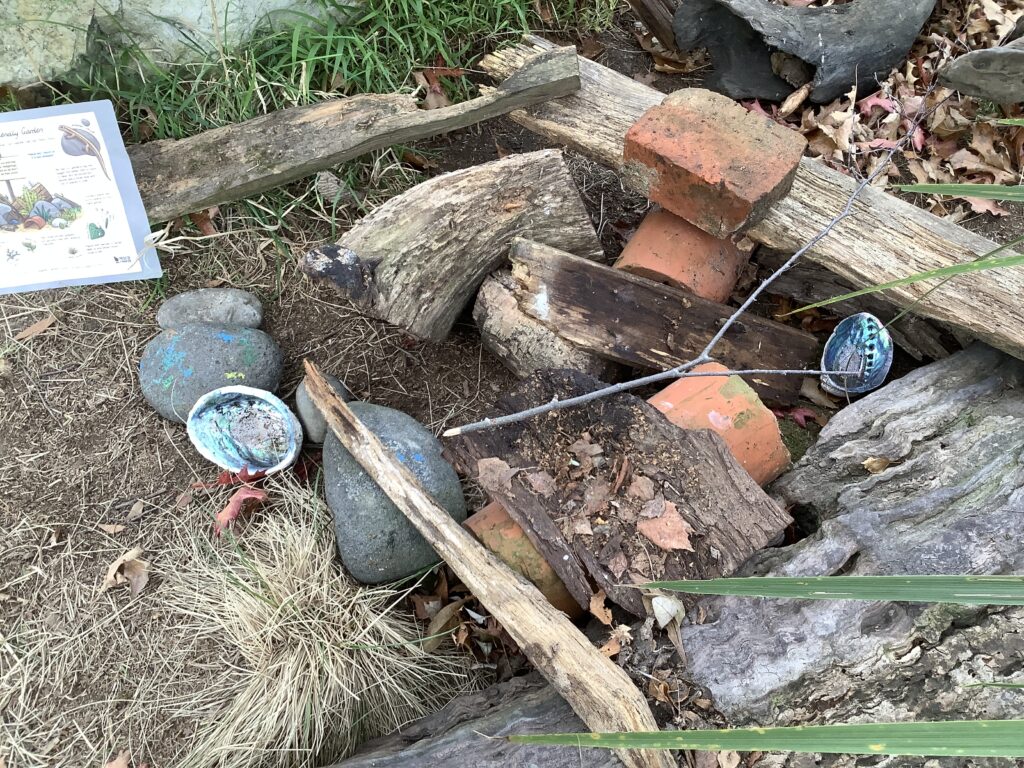 Look at this fabulous lizard garden! After weeks of planning…. researching…. chatting about and playing with the lizard garden map, we have put it all into action and made a rather wonderful 3-dimensional space for any lizards that might be passing by to live in. We referred to our research to find places for them to hide under and in…. and transported it all up to the hill in the ngāhere.