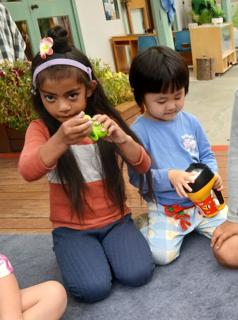 They started by exploring the torches. When they turned them on tamariki talked about how the batteries have a chemical in them that turns into energy which then makes the light shine. The winding torches quickly became a firm favourite! Tamariki discovered that by turning the handle with their hand they could create kinetic energy which powered the light. They were excited to see that their own movement could create the energy needed for the torch to work.