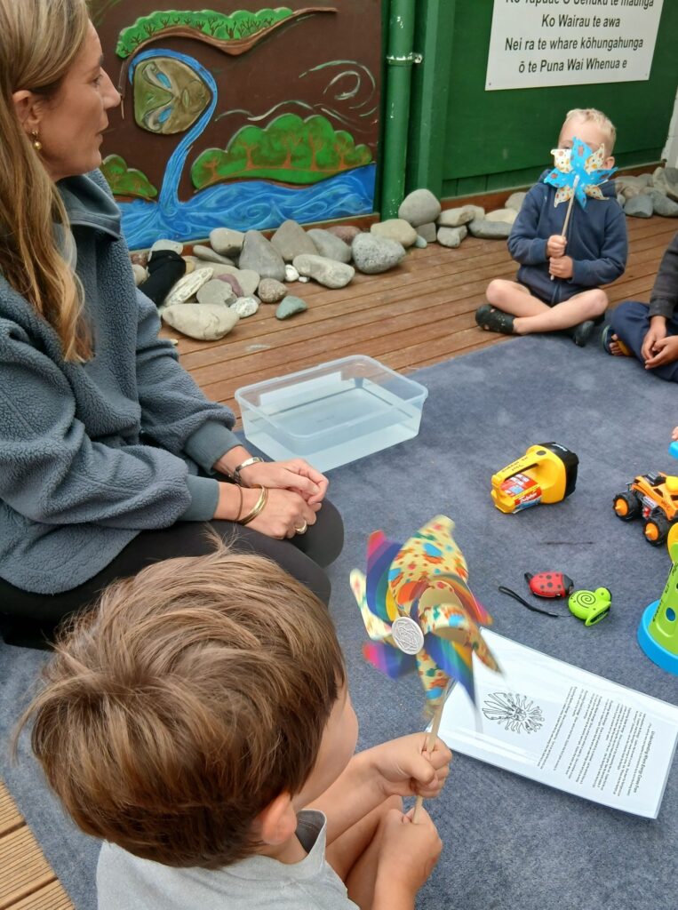 Next tamariki experimented with the pinwheels, using their breath to create wind and make them spin. This reminded them that wind carries energy too. They chatted about the wind and how Tāwhirimātea, the atua of the winds, and weather is connected. Some great ideas came up about if the wind is stronger will it create more energy? And “I’ll do it really lightly and it still goes around”.